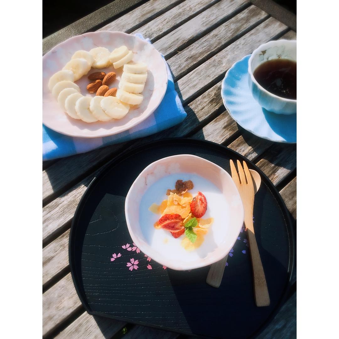 早安~早餐打卡!草莓玉米片优格,香蕉搭烤杏仁。健康早餐