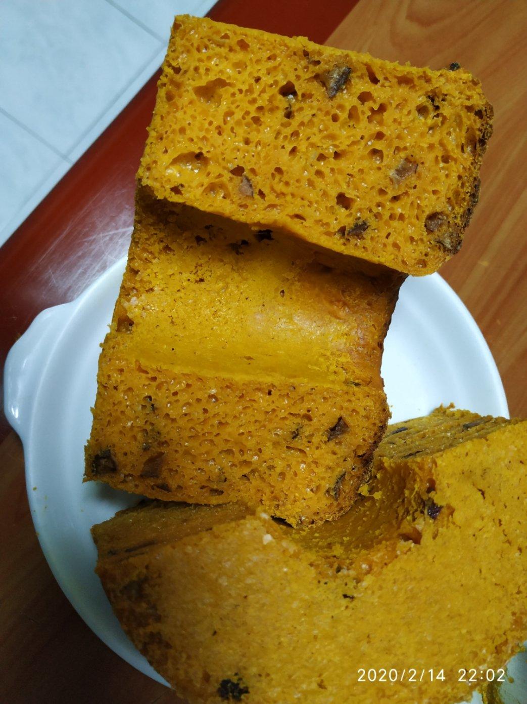 本来想做馒头,普通南瓜放电饭锅煮饭档好了后直接就扔面包机,随便往里面加面粉看它还是很细烂,立马改主意做发糕吧,抓把切吧好...