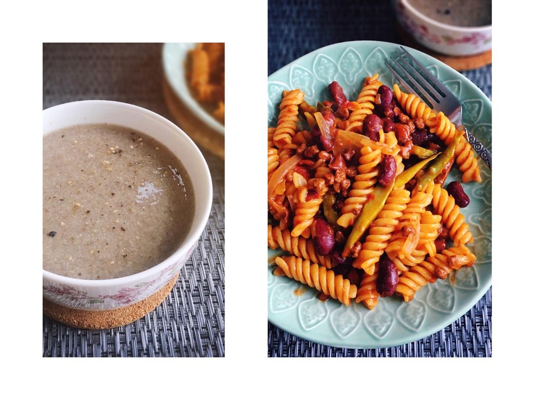 蘑菇汤 辣牛肉红腰豆炒螺旋意面