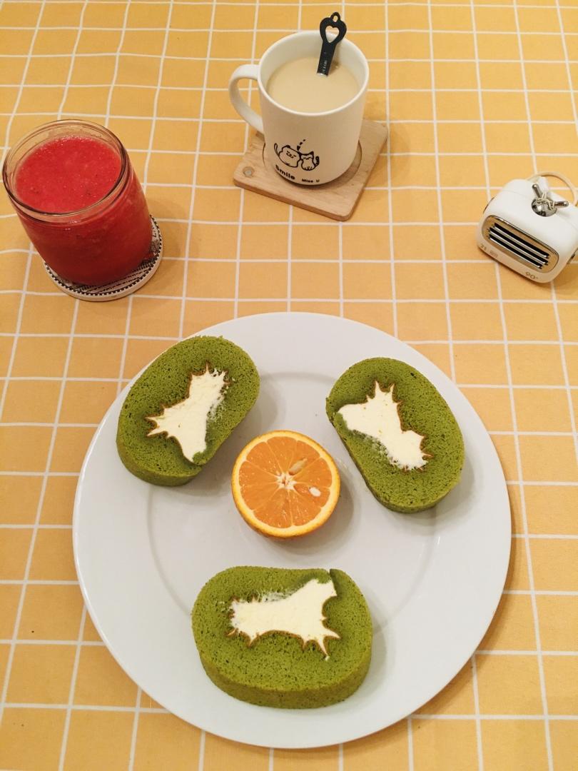 早餐……西瓜汁+奶咖+抹茶瑞士卷……此卷差点败给了双黄蛋,亏得我技术好...