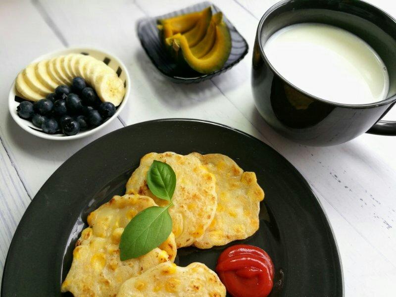 香煎玉米饼,牛奶,小贝贝,香蕉,蓝莓~