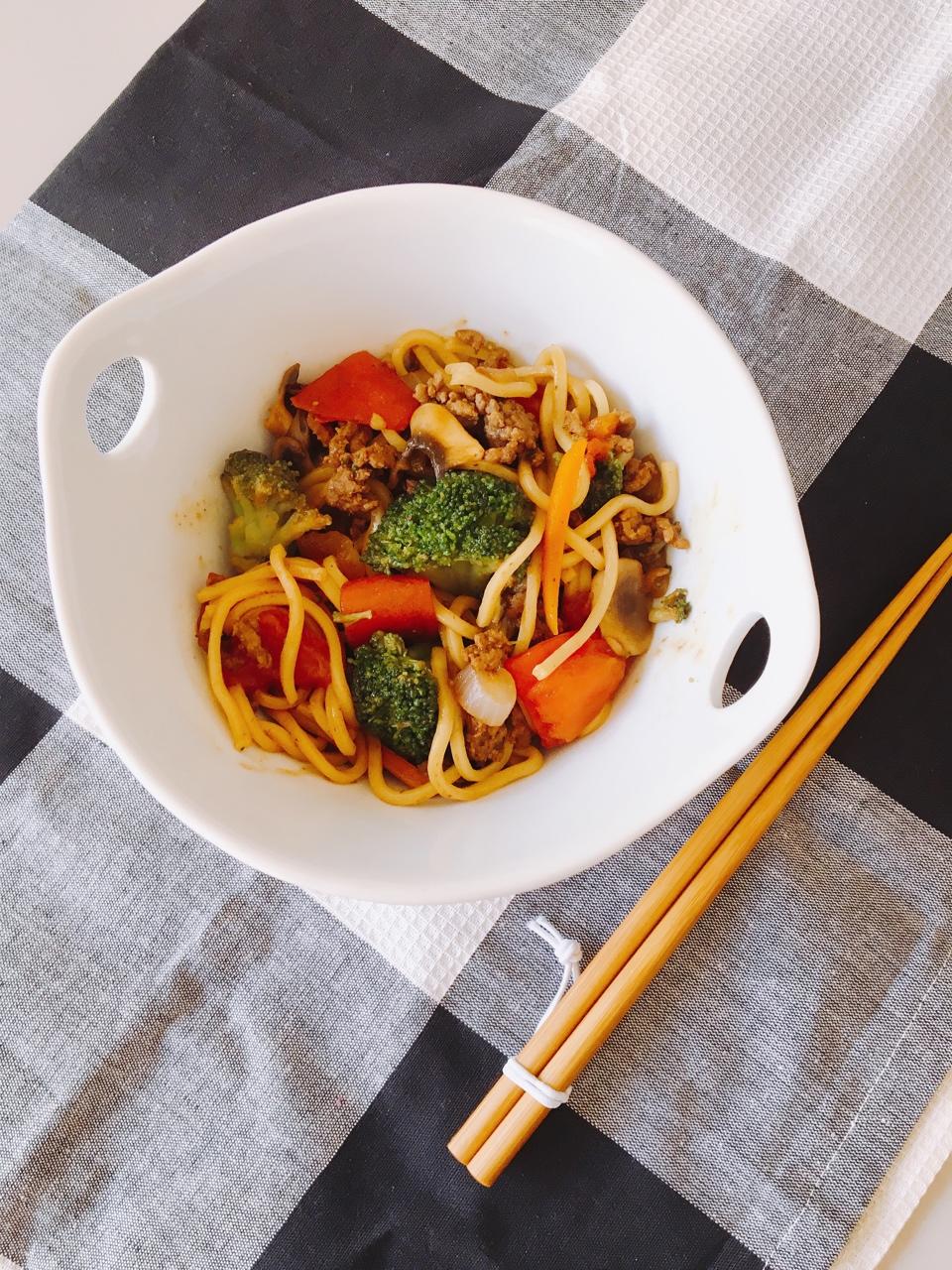 酱油放多了一点的帝王炒面 牛肉洋葱番茄蘑菇西兰花胡萝卜