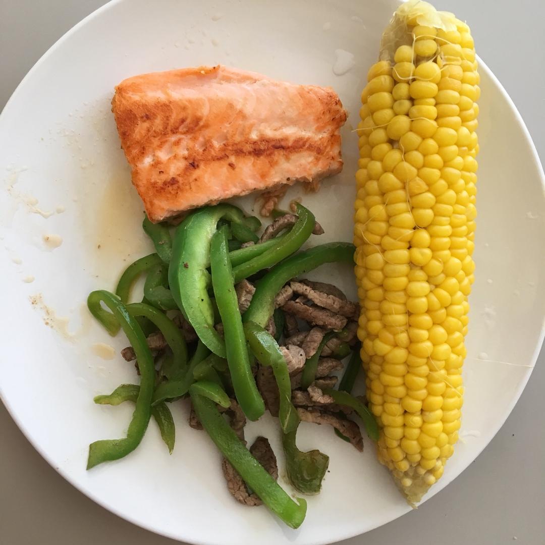 煎三文鱼+鲜虾牛油果火腿土豆沙拉 我还差一朵西兰花
