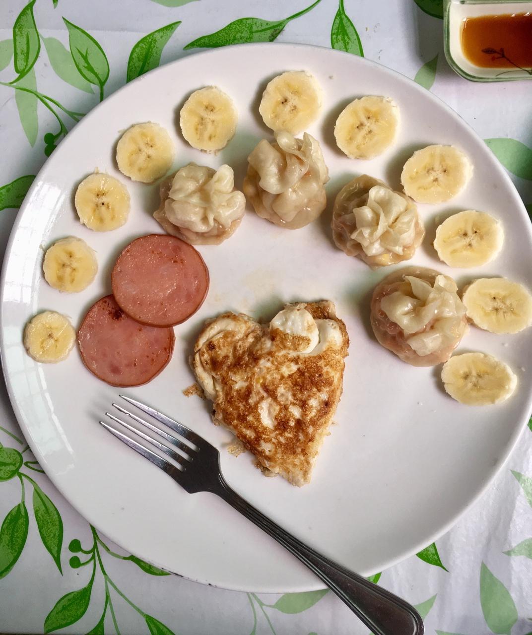 美好的一天从早餐开始!我和闺蜜的小日子~🌽饺子➕🍳火腿片➕🍌
