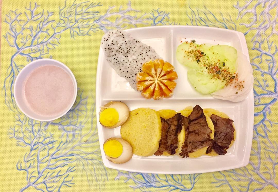 吃好早餐开始新的一周,三合面馒头➕酱牛肉➕卤蛋➕水果➕时蔬➕红豆核桃露。牛气十足能量爆棚[偷笑] #早餐•2017年5月...