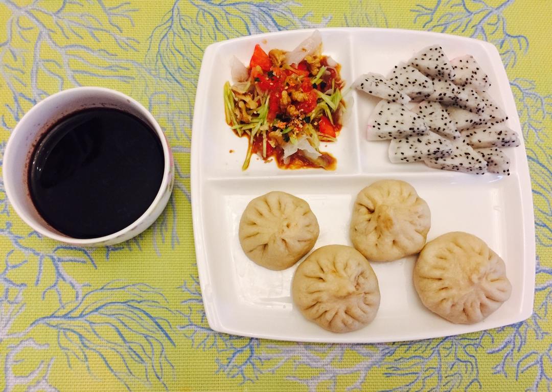 早安各位亲🌞!突发奇想做了个全麦香菇酱肉包,酱香浓郁!➕桃仁拌时蔬➕火龙果➕黑米粥。好味道好心情❤️ #早餐•2017年...