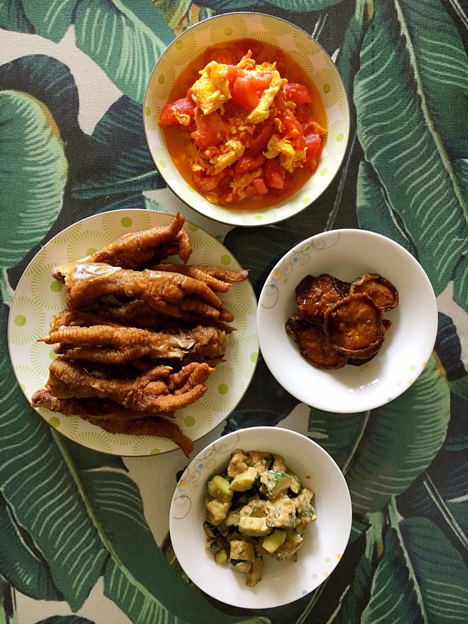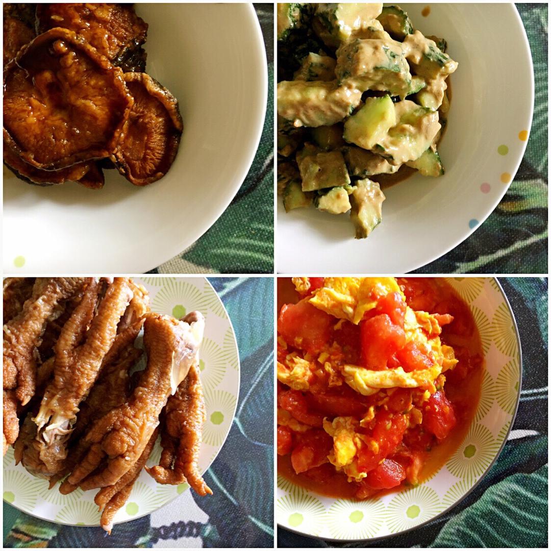 酱鸡爪+西红柿炒鸡蛋+蚝油香菇+麻汁黄瓜😜