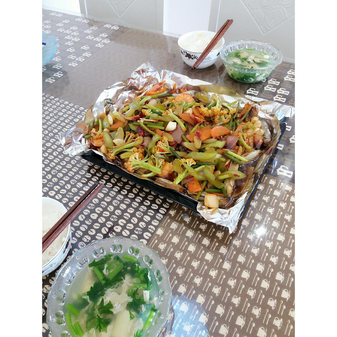 加了大虾,蛏子和好多蔬菜的烤鱼