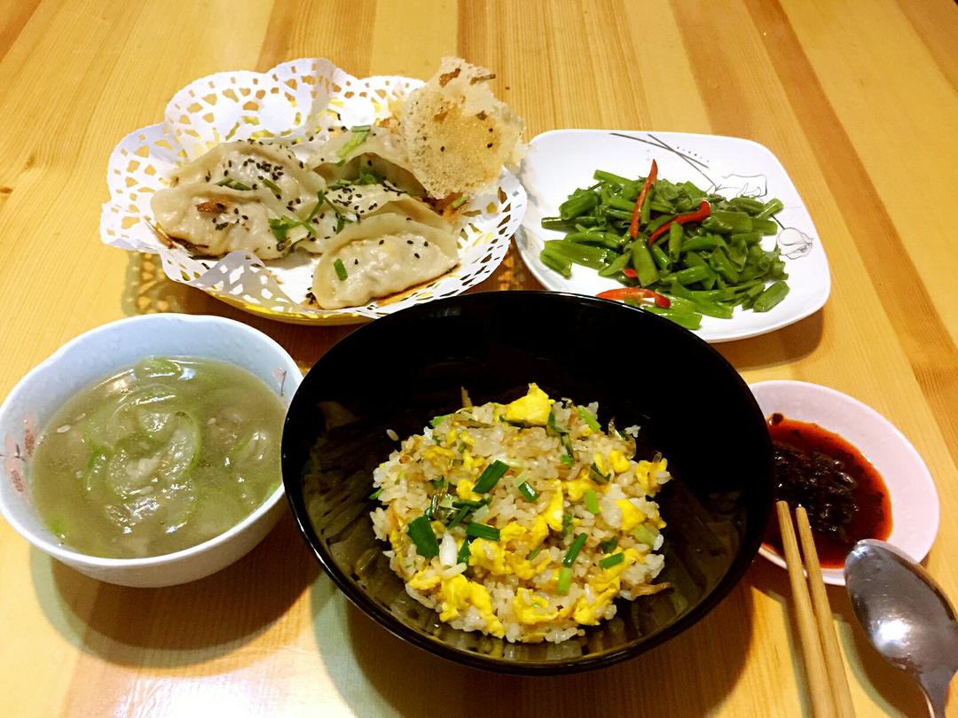 早安!🍒娜姐的早餐🍒虾皮蛋炒饭、煎饺、清炒空心菜、丝瓜汤