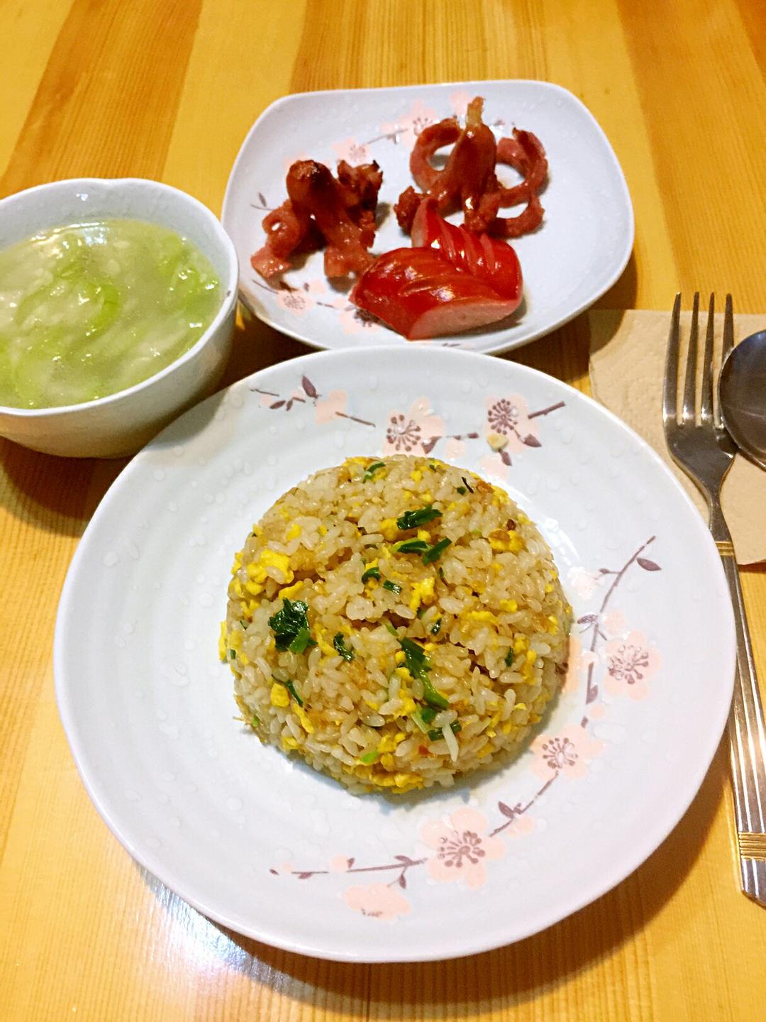 早安!🍒娜姐的早餐🍒虾皮蛋炒饭、丝瓜汤、香肠