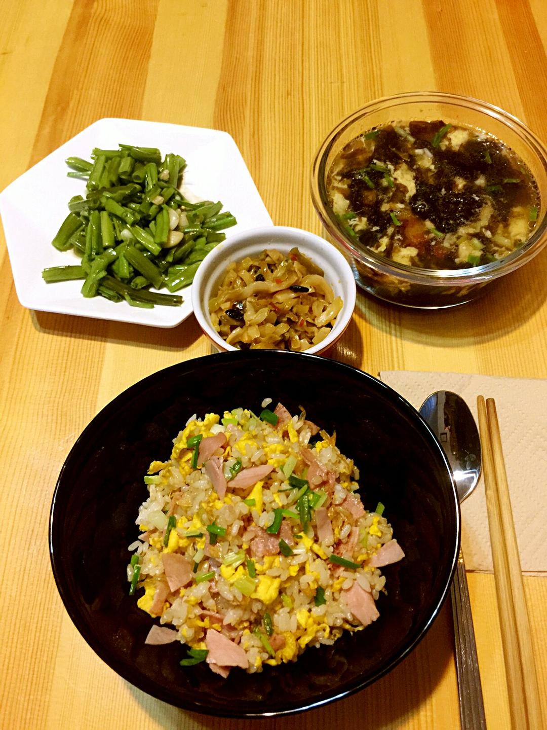 早安!🍒娜姐的早餐🍒虾皮火腿蛋炒饭、剁椒豆鼓榨菜、蒜蓉空心菜、西红柿紫菜蛋花汤