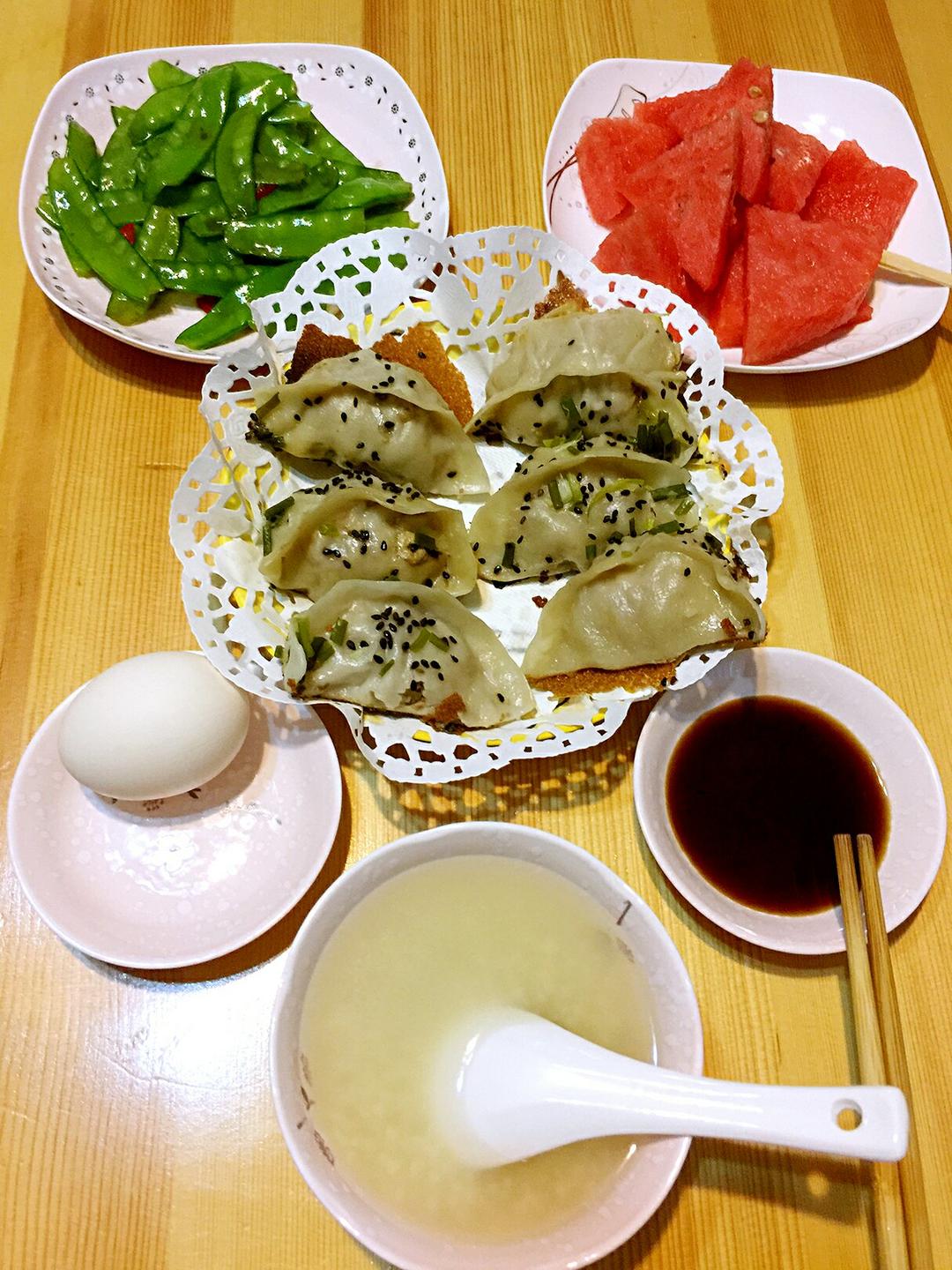 早安!🍒娜姐的早餐🍒小米粥、白水蛋、煎饺、清炒荷兰豆、西瓜