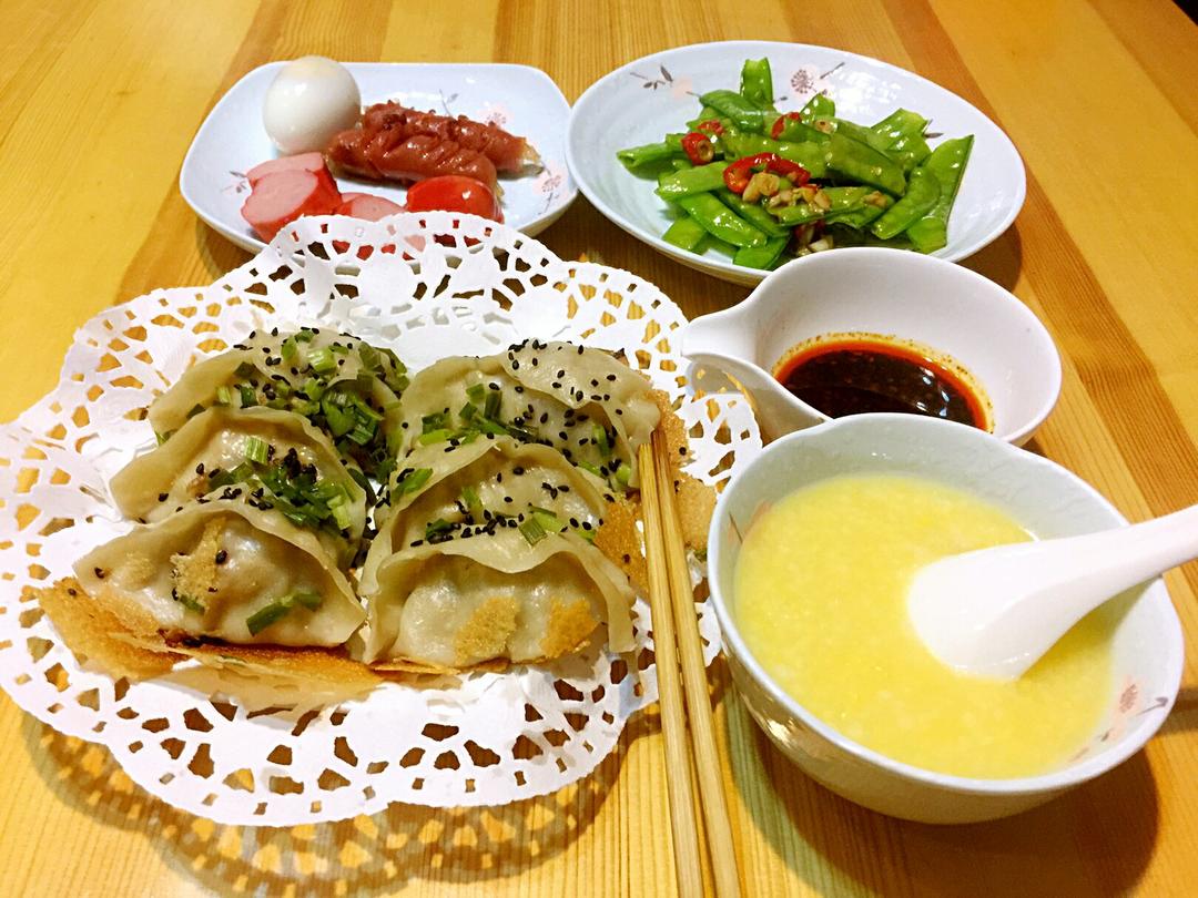 早安!🍒娜姐的早餐🍒玉米粥、煎饺、白水蛋、小香肠、红肠、蒜泥荷兰豆