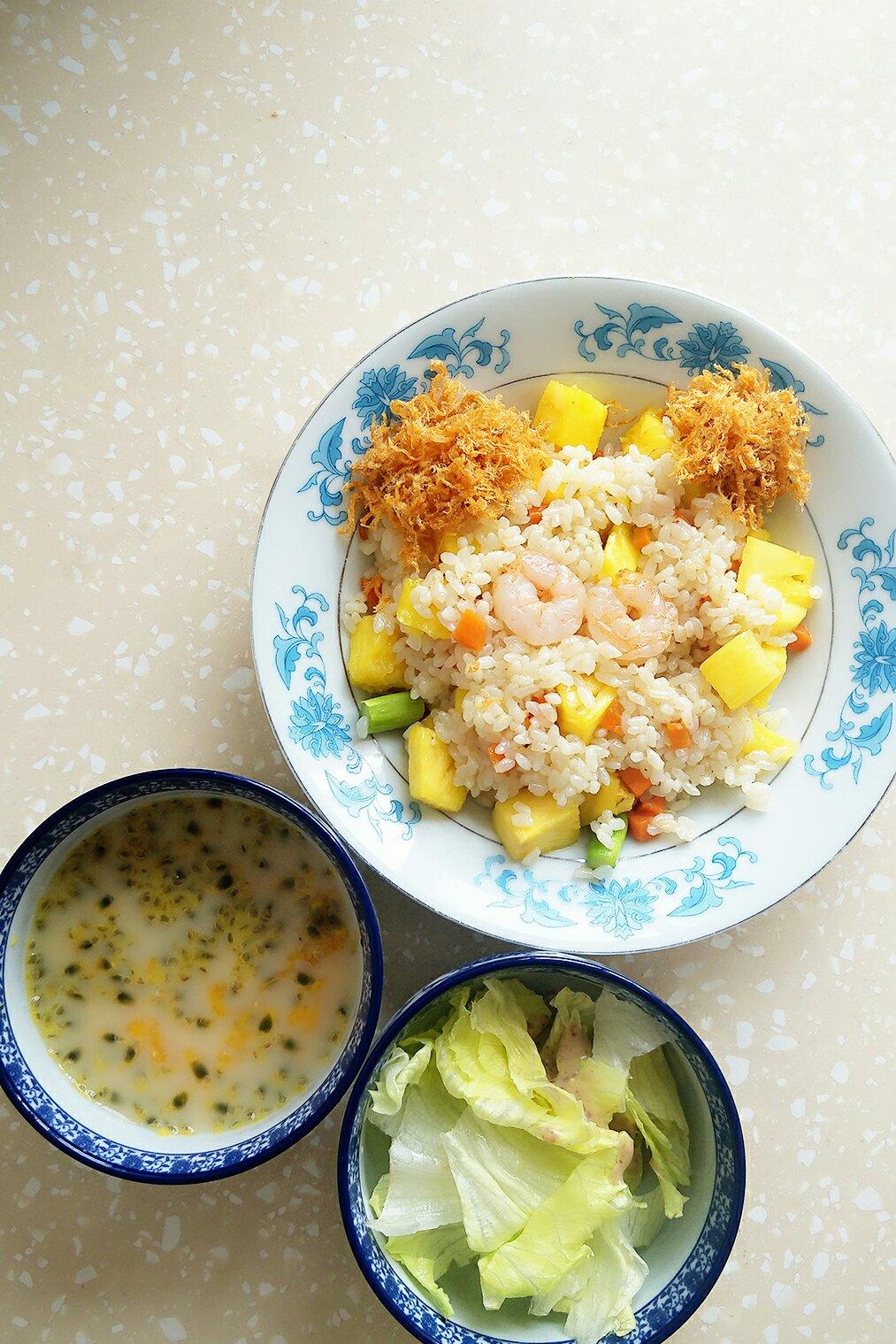 半日课午餐:凤梨炒饭,百香果养乐多,草一碗
