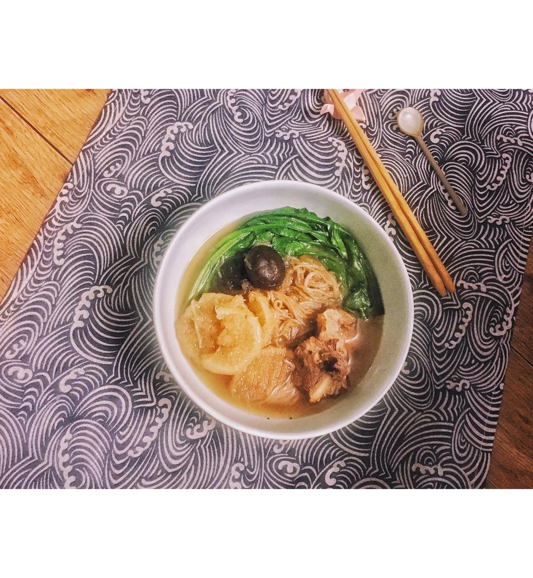 排骨·白萝卜·干鲜菇·菠菜·荞麦面。