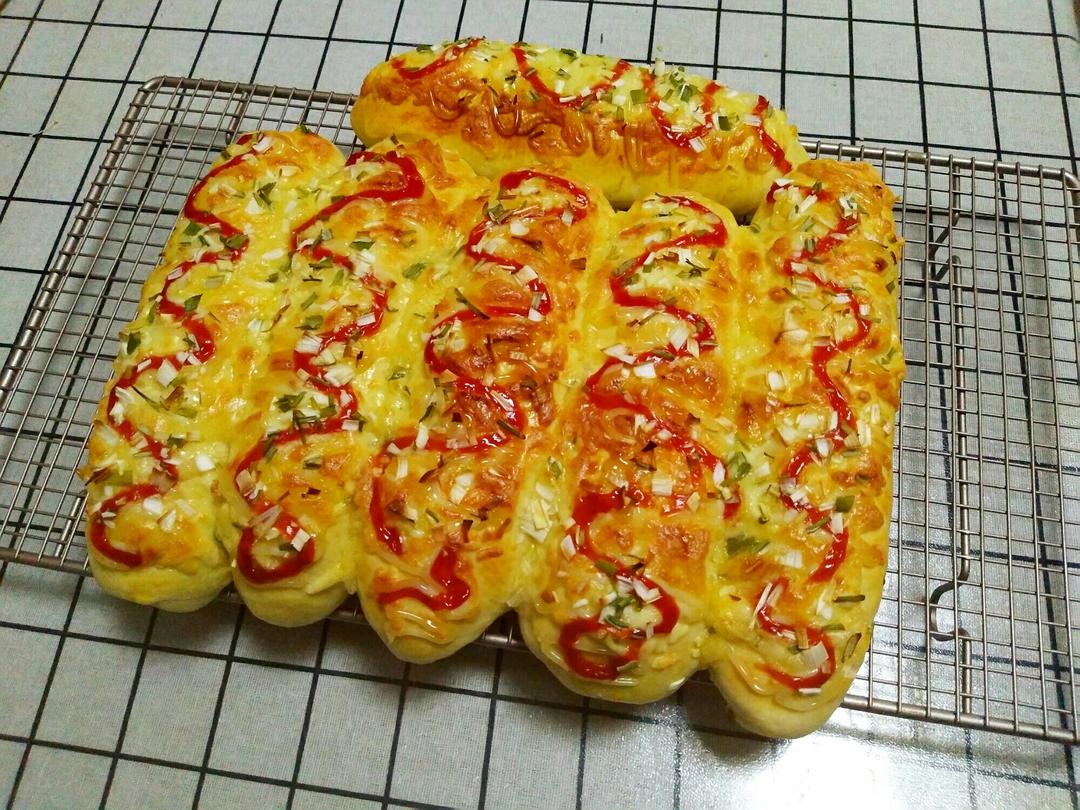 再来一份儿好吃的葱香芝士面包,方子略有改动,做了三个肉松的,五个培根的!一如既往的...