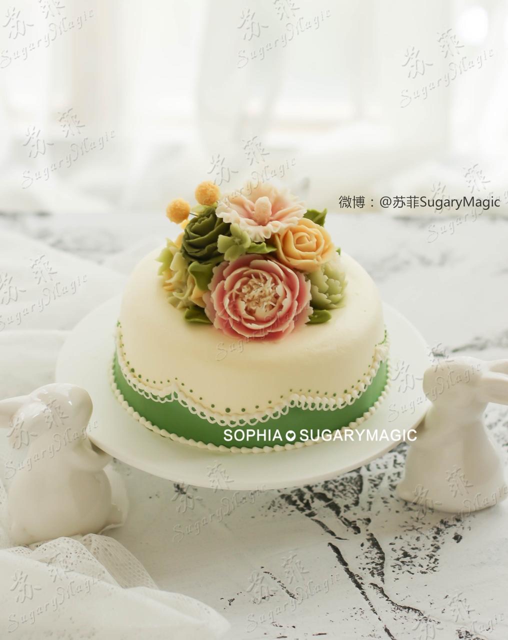 #苏菲豆沙裱花# 美丽精致的一款基础韩裱!花是豆沙花,抹面是淡奶油,蛋糕是戚风……综合课才有的基础裱花课哦!😉#豆沙裱花...