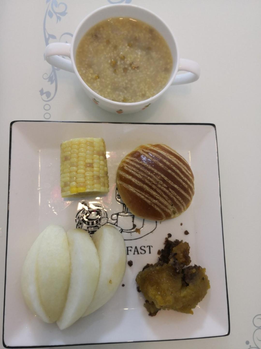 20190531早餐打卡:小米绿豆粥+豆沙粽+蜜梨+糯玉米