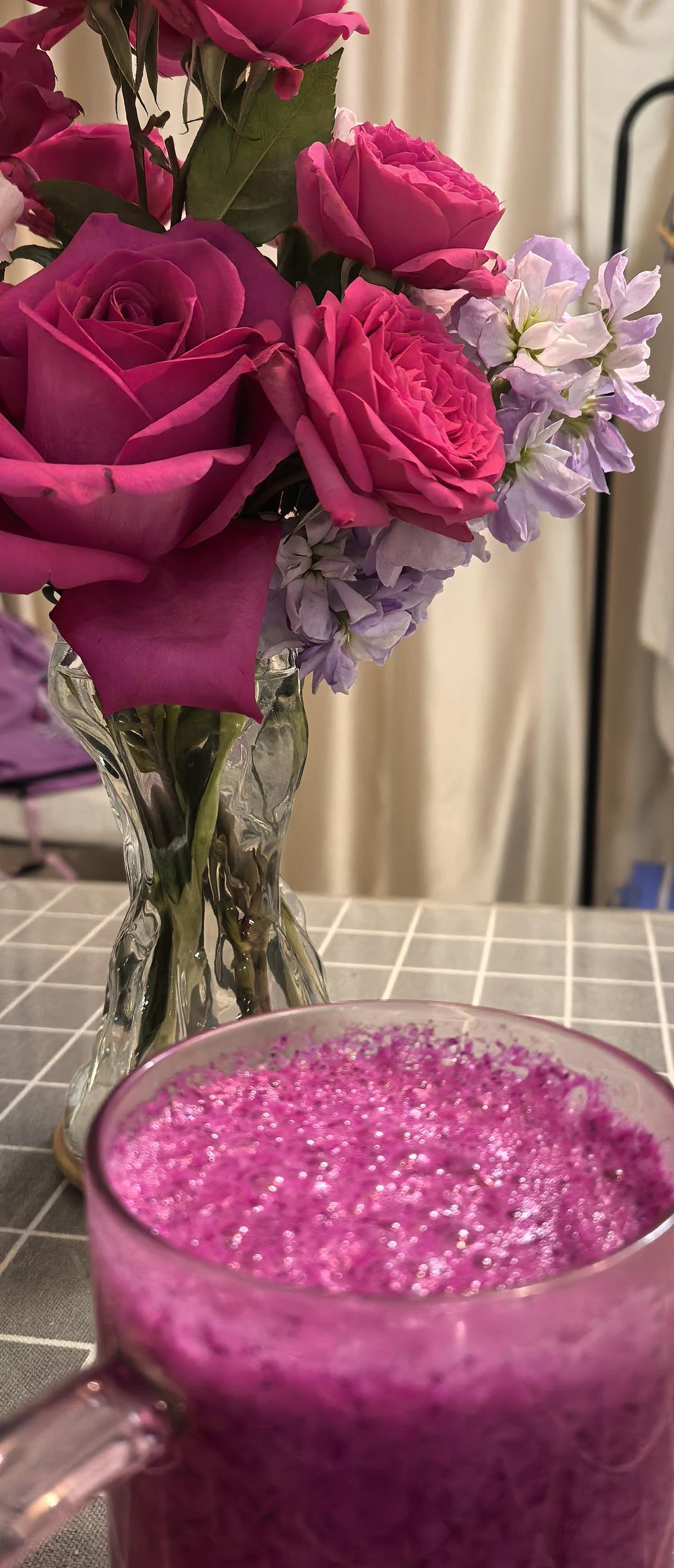 同事给了一个超大火龙果,和老公两个人都没有吃完,剩下的加上牛奶用豆浆机打了个奶昔,味道美美哒!