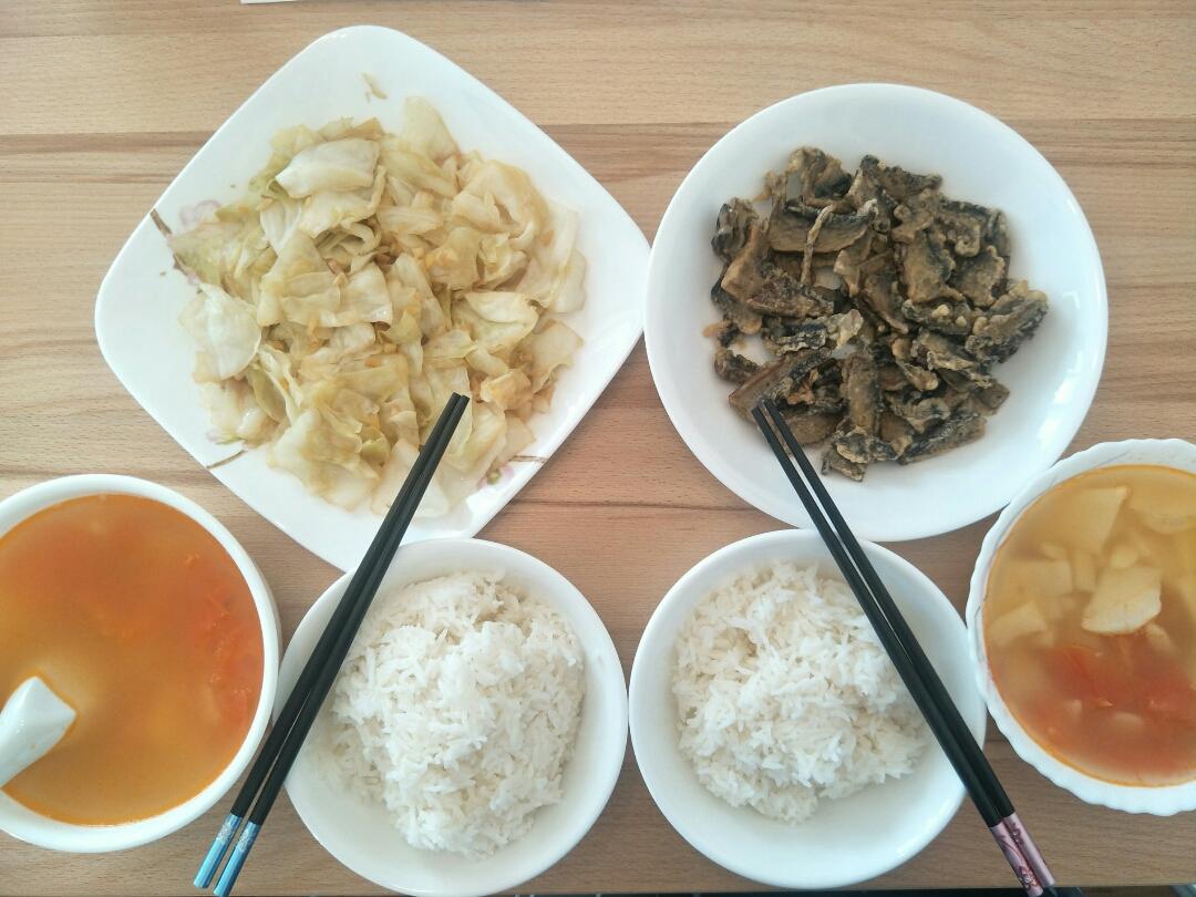 椒盐蘑菇,清炒包菜,番茄土豆汤