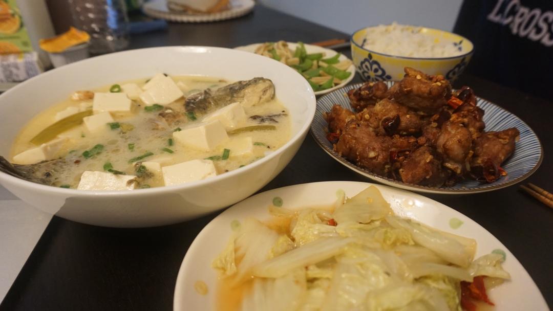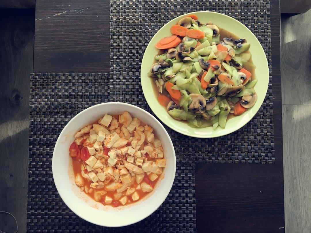 番茄豆腐鱼和胡萝卜黄瓜炒蘑菇