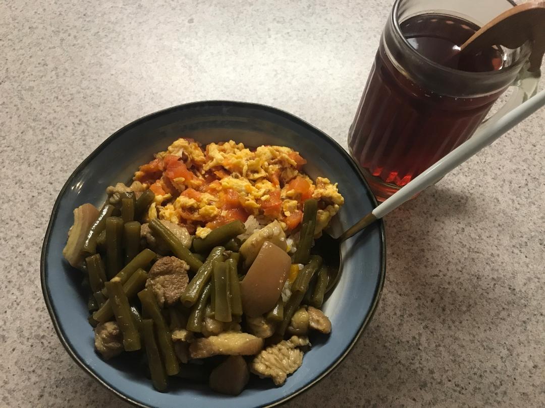 鸡蛋番茄和猪肉焖豆角,米饭是昨天剩的南瓜焖饭,配冰镇绿豆水