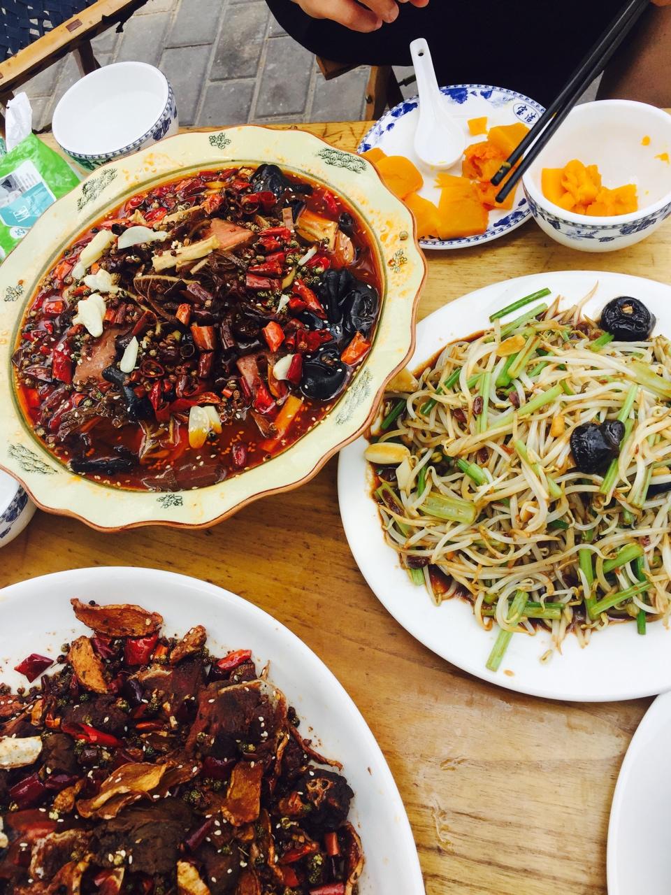 大盘干煸鸭!分量足!好吃!毛血旺,蜂蜜南瓜煲!老爷们儿钓鱼,女人们吃西瓜看孩子。。
