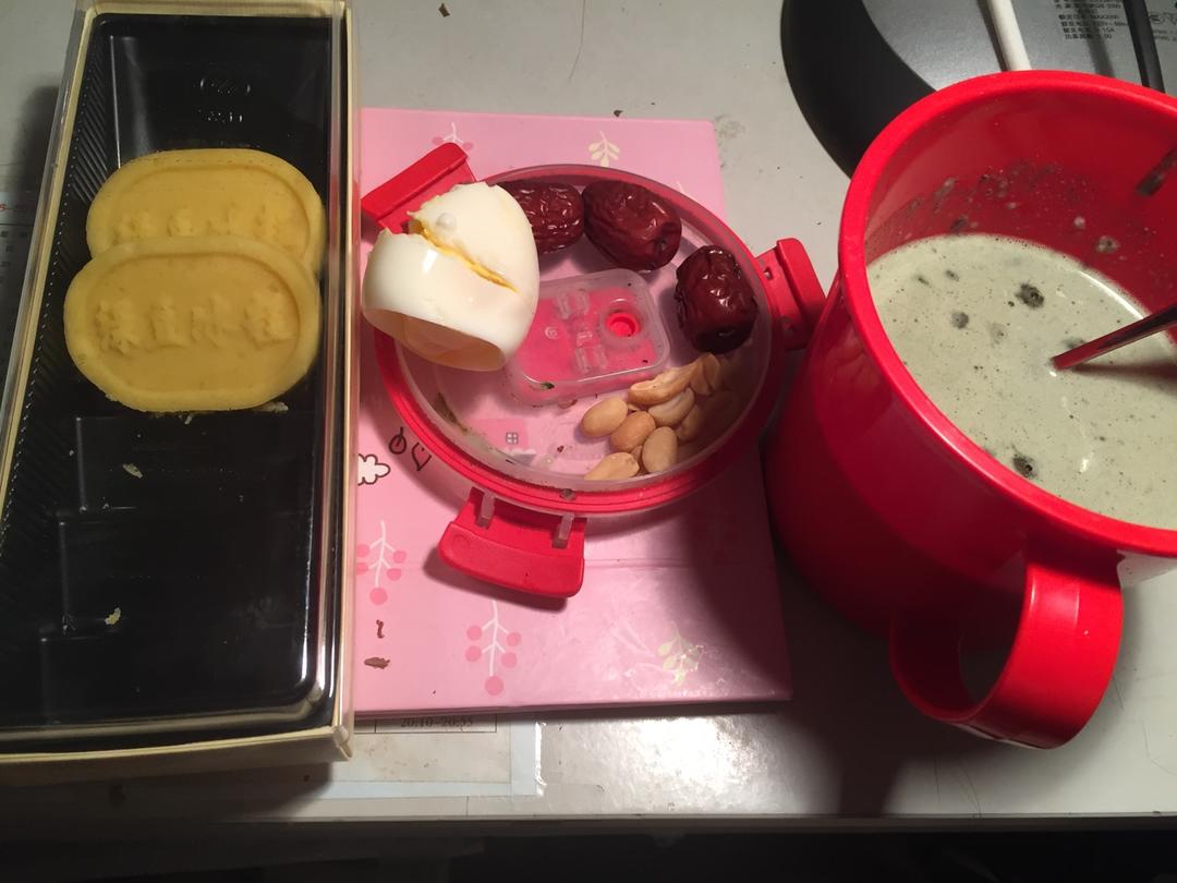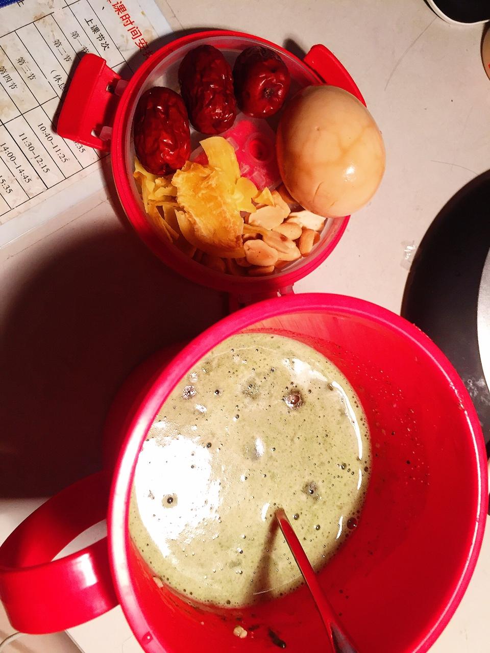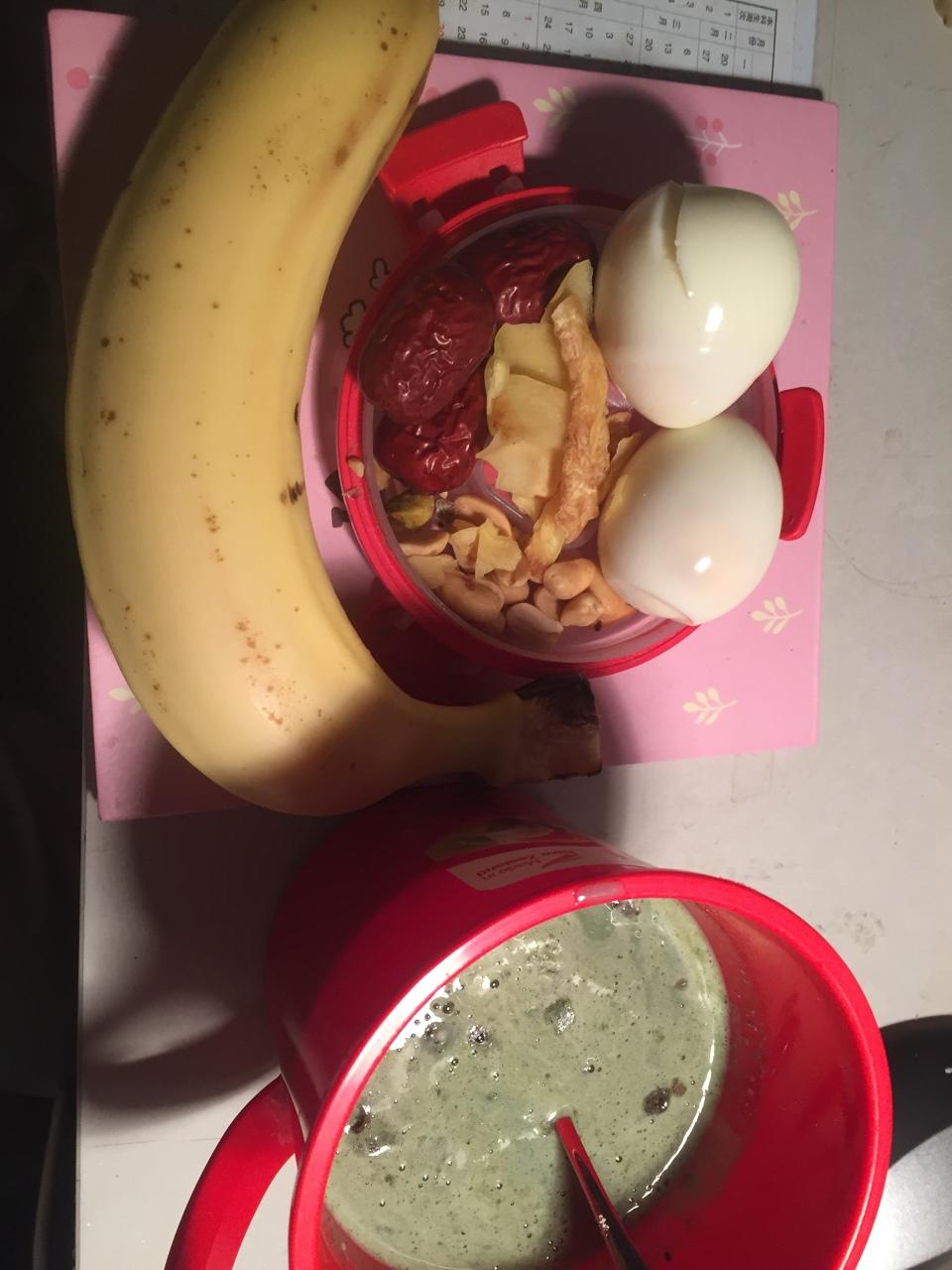 每天自制营养早餐~宿舍人都睡了,静悄悄。泰国榴莲干,盐焗坚果,卤蛋,红枣,还有五谷养生粉~里面还冲了奶粉,青汁,澳洲燕麦...
