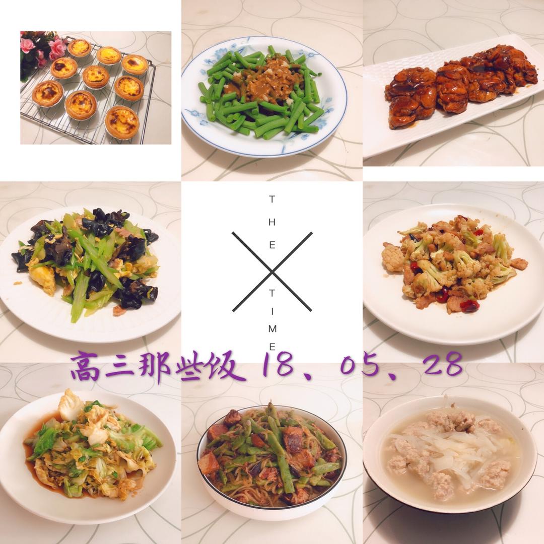 蛋挞、凉拌豇豆、日式照烧鸡腿、肉片炒芹菜、干锅菜花、蚝油圆白菜、炖肉烩豆角、白萝卜粉丝丸子汤 #晚餐•2018年5月28...