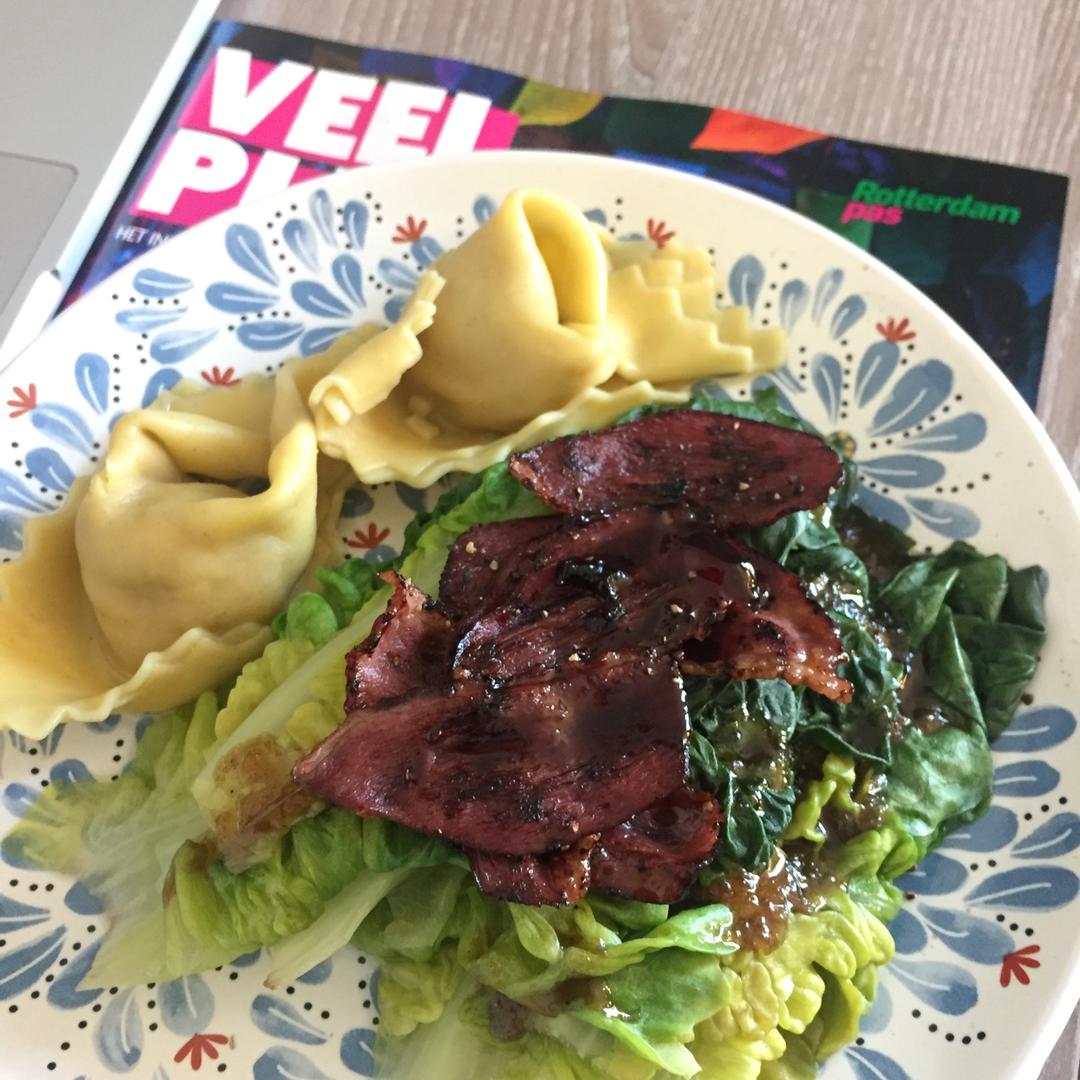 不常用食材集合的油醋汁色拉 菊苣 鹅莓 加一颗水波蛋 一个番茄切丁 一个番茄打汁 底菜 菊苣丁和彩椒 #晚餐•2017年...