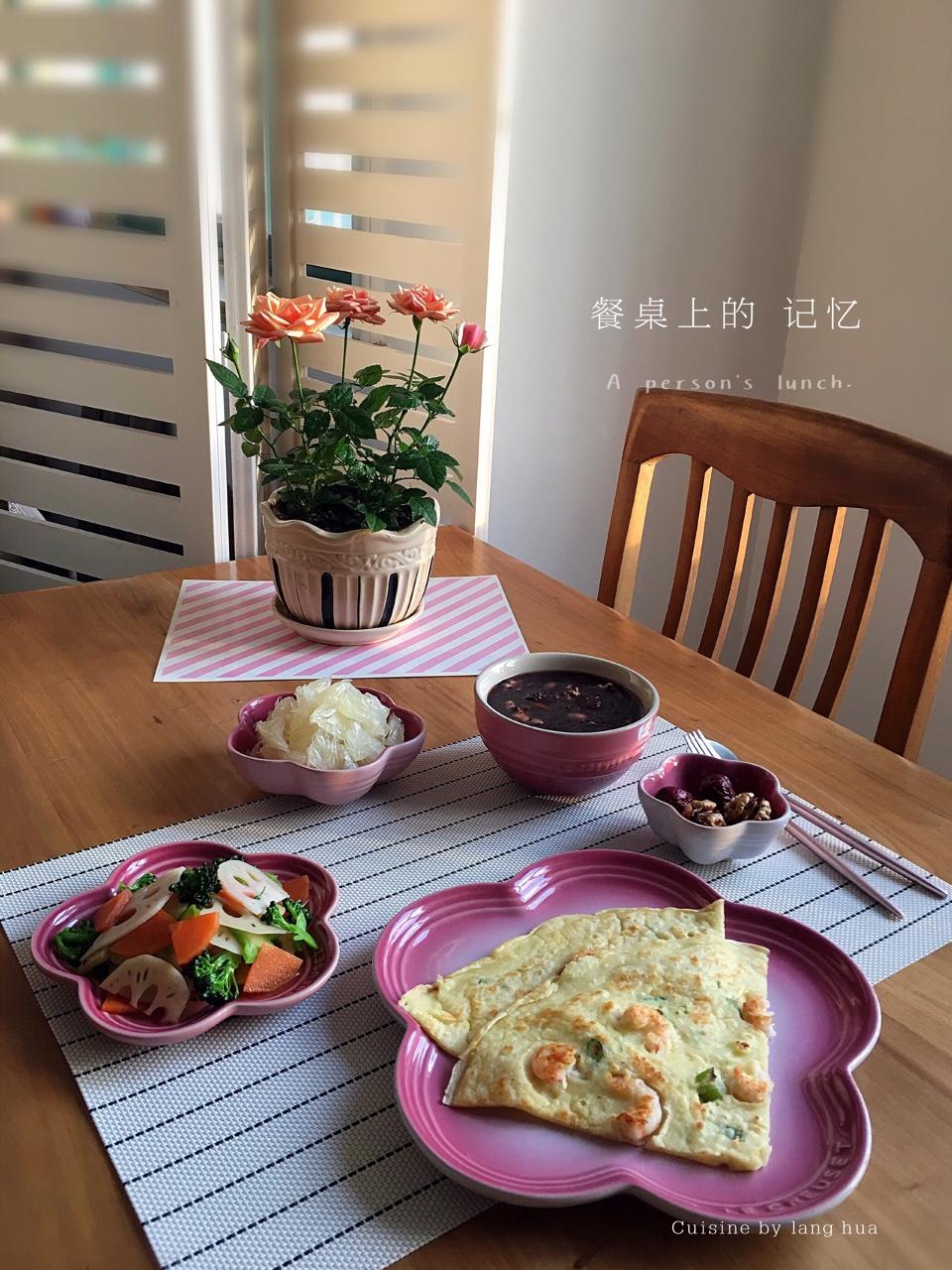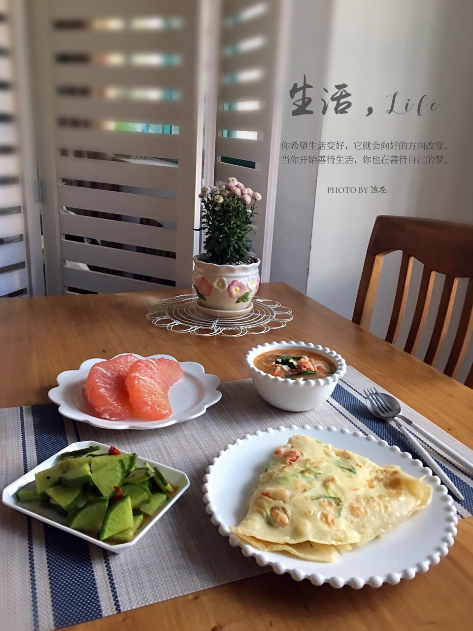 周五早餐~拌杂蔬、虾仁鸡蛋饼、红枣杂粮粥、核桃+红枣、甜柚。早上好🌹
