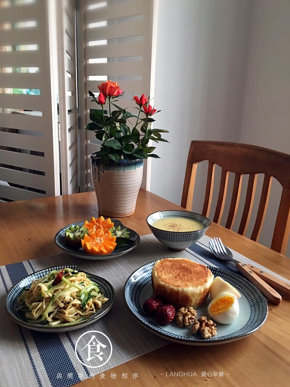 早上好🌹早饭~豆腐皮拌黄瓜丝、红糖火烧、鸡蛋+核桃、红枣、玉米糊、甜桔+猕猴桃。