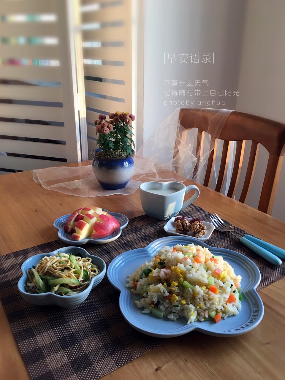 周二早餐~黄瓜丝拌豆腐皮、五彩蛋炒饭、牛奶、核桃+枣、苹果。早上好🌹