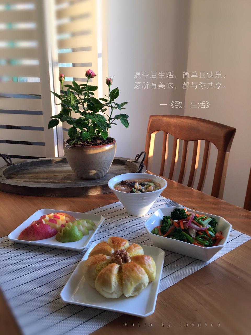 周五早上好🌹早饭:西兰花拌胡萝卜丝、椰蓉面包、西红柿金针菇汤、苹果+香梨。