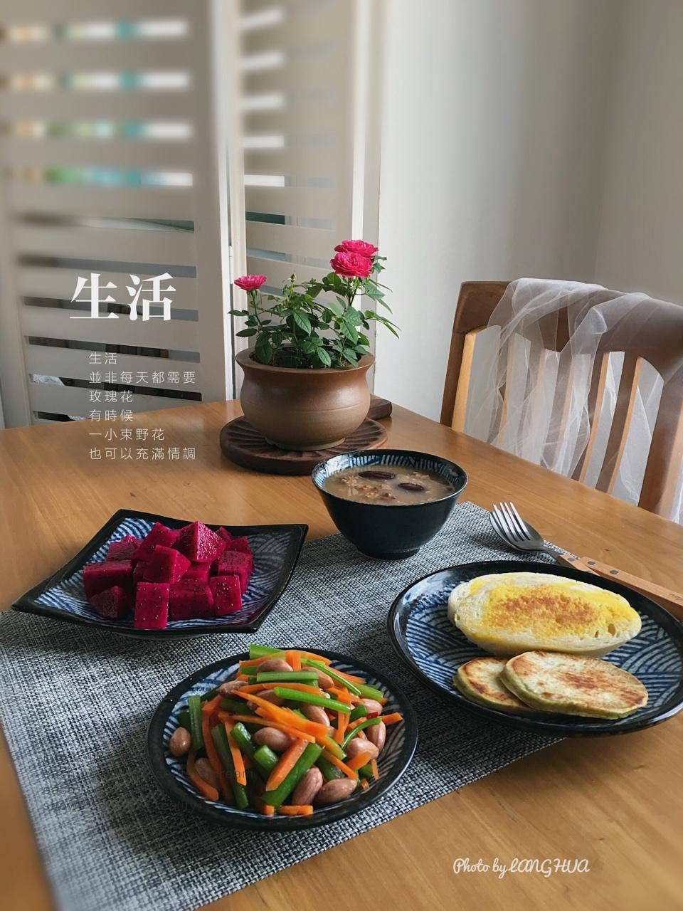 早上好🌹早饭~芹菜胡萝卜拌花生米、黄金馒头片+地瓜片、红枣杂粮粥、火龙果。