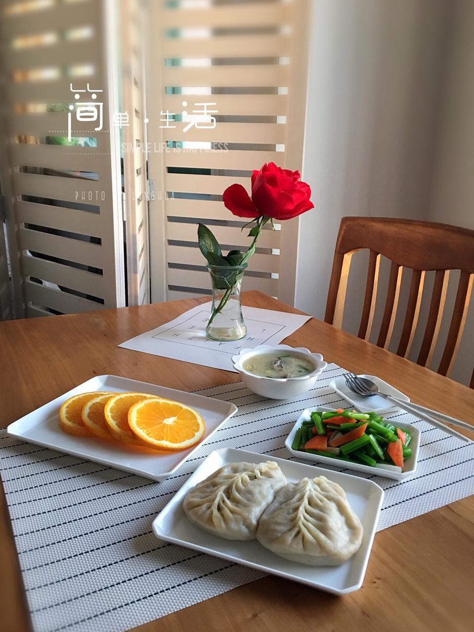 早安新一天🌹早饭~~鲍芹拌胡萝卜、白菜小包、海鲜咸粥、橙子。