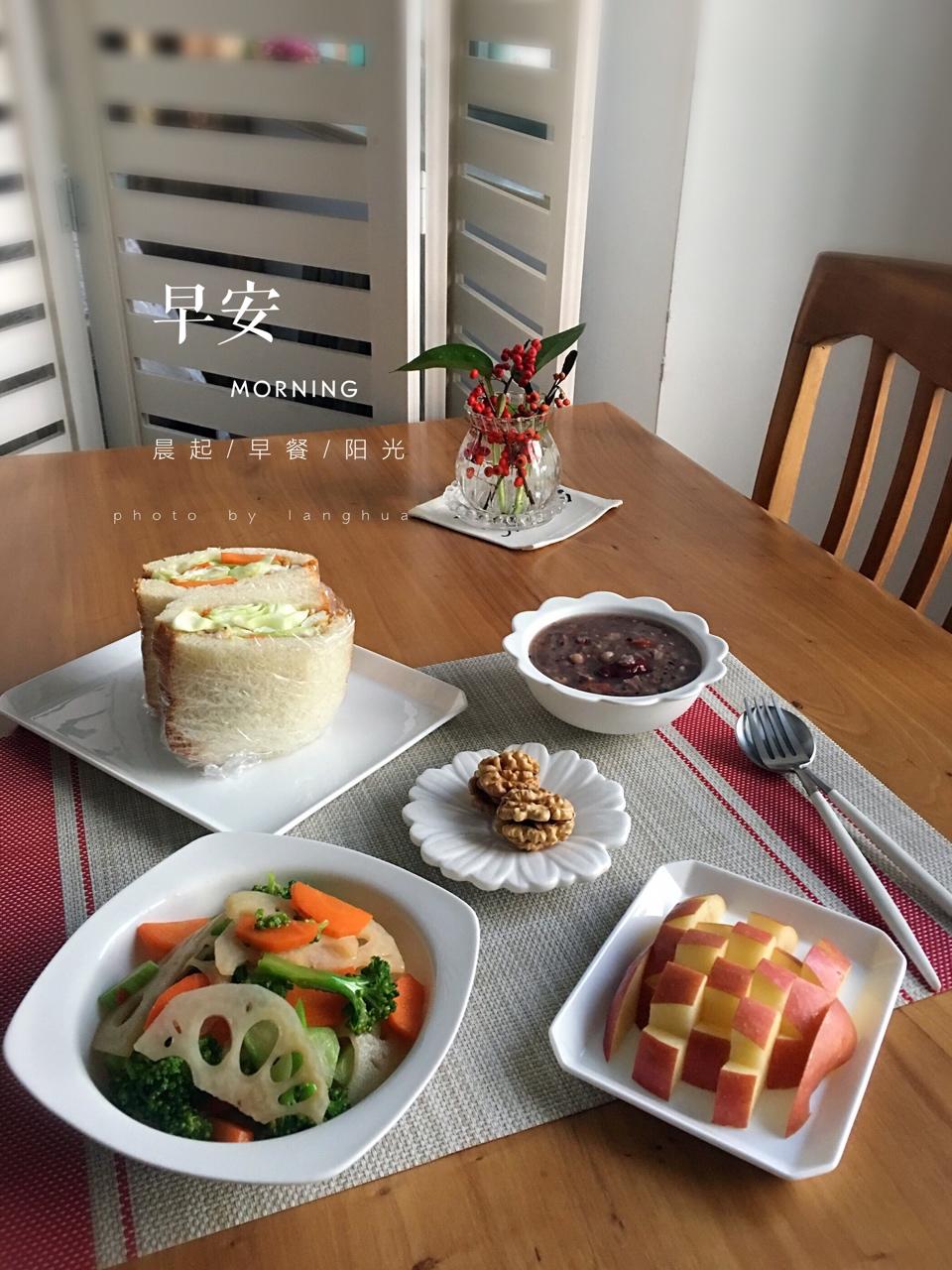 早饭~凉拌杂蔬、三明治、紫薯杂粮粥、核桃、苹果。早上好🌹