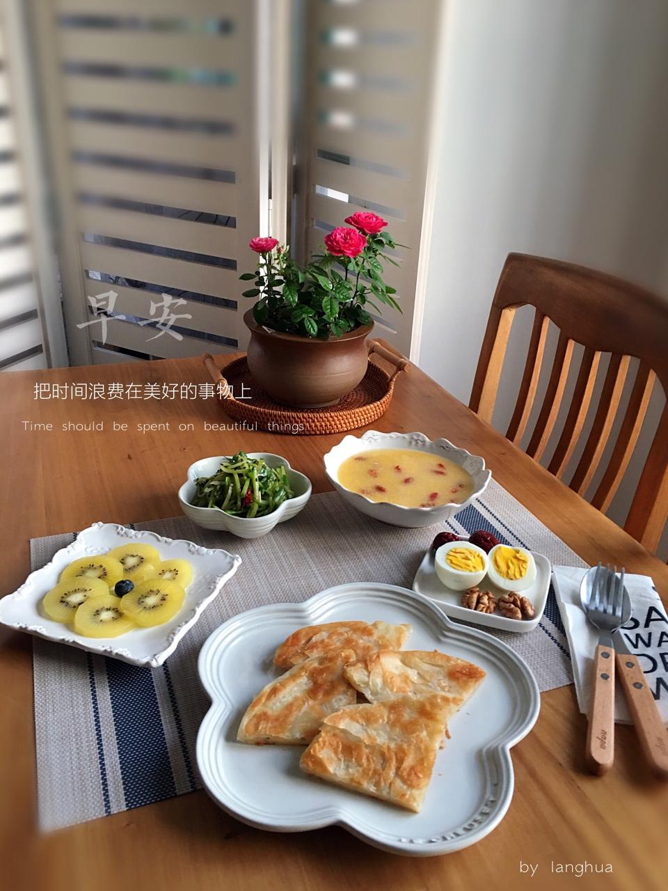 周一早上好🌞🌹早饭~凉拌萝卜丝、葱油饼、玉米茬、鸡蛋、核桃、红枣、猕猴桃。