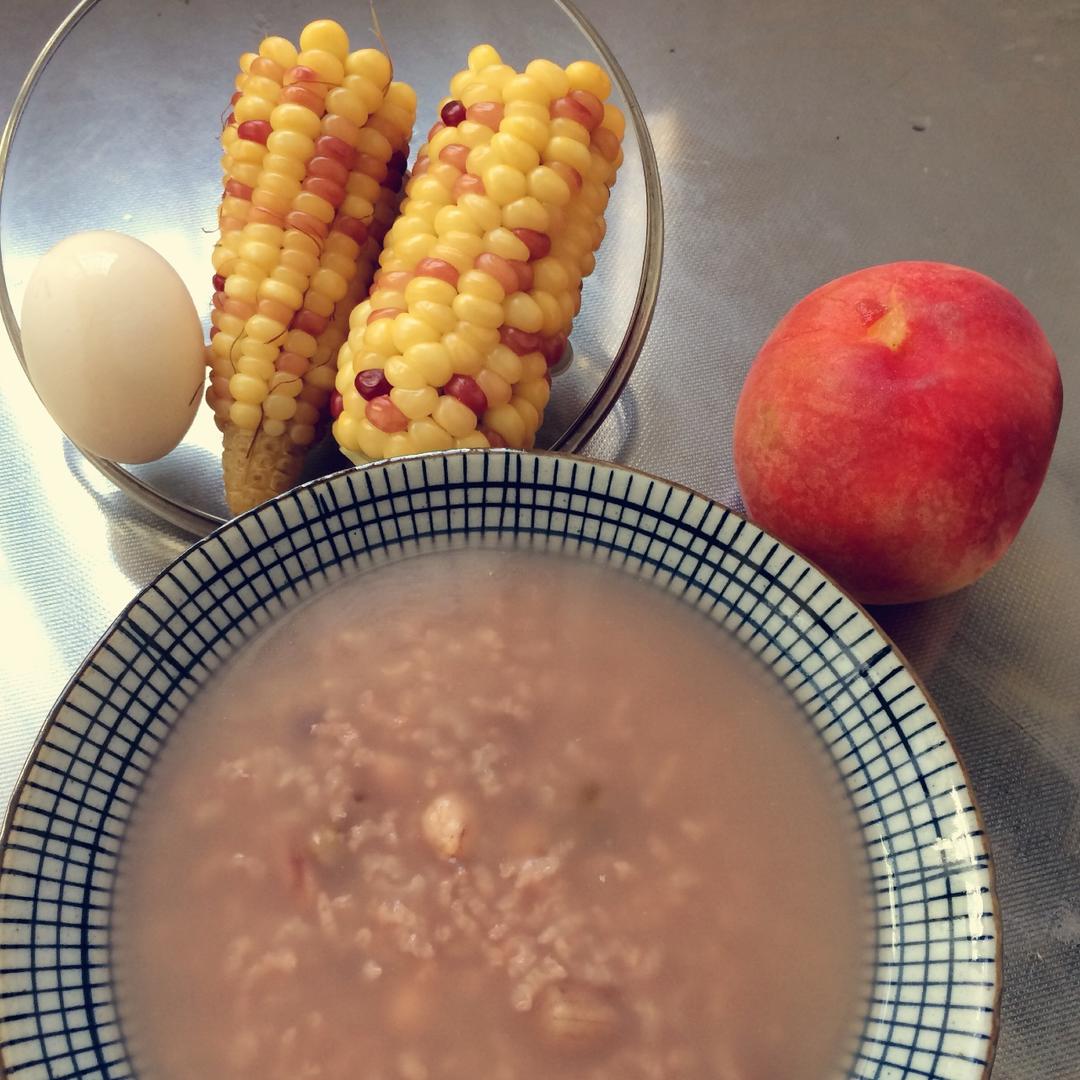 毕业上班第一天的早餐。晚上没休息好。粥是前一天晚上预约好的。早上起得晚了,匆匆忙忙煮了鸡蛋和玉米。一人食碗盘套餐还在路上...