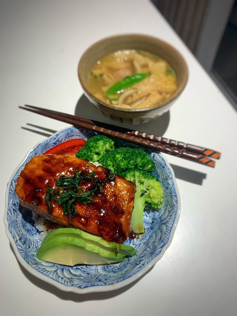 照烧三文鱼、搭配蔬菜和味增豆皮汤~~~~然后还有日式煮南瓜忘放进去拍了[捂...