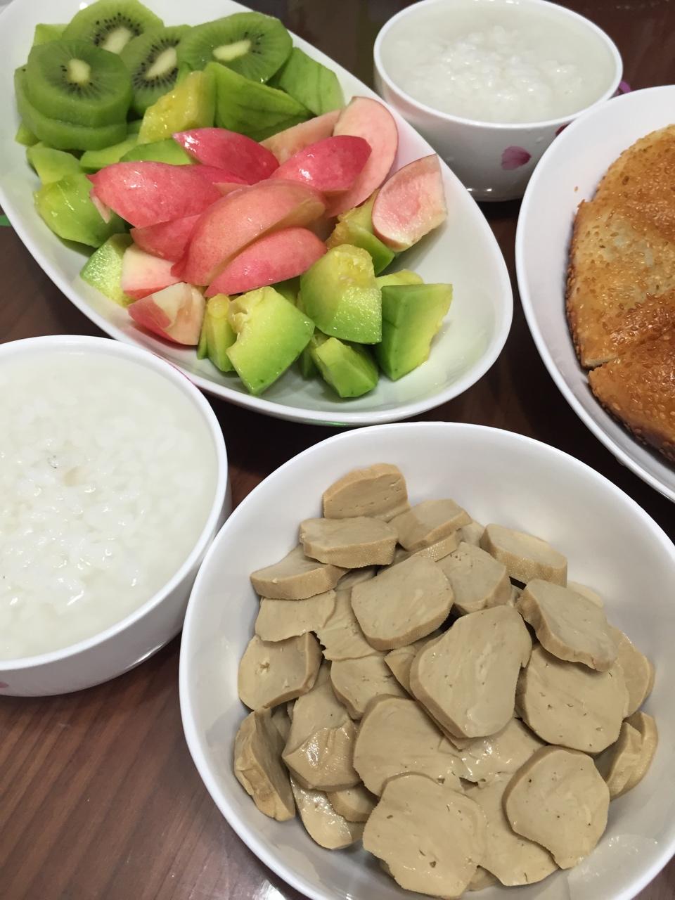 粥,五香小素鸡,豆沙麻饼,水果