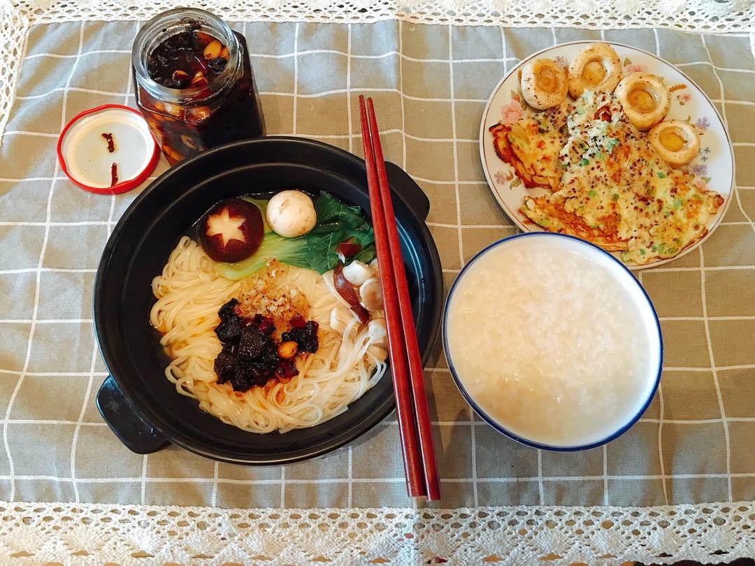 2017.7.8 左边我的面,右边儿子的粥饼和口蘑。王敏妈妈的牛肉酱超好吃,一不小心就吃多了,所以一定要控制,一小筷,一...