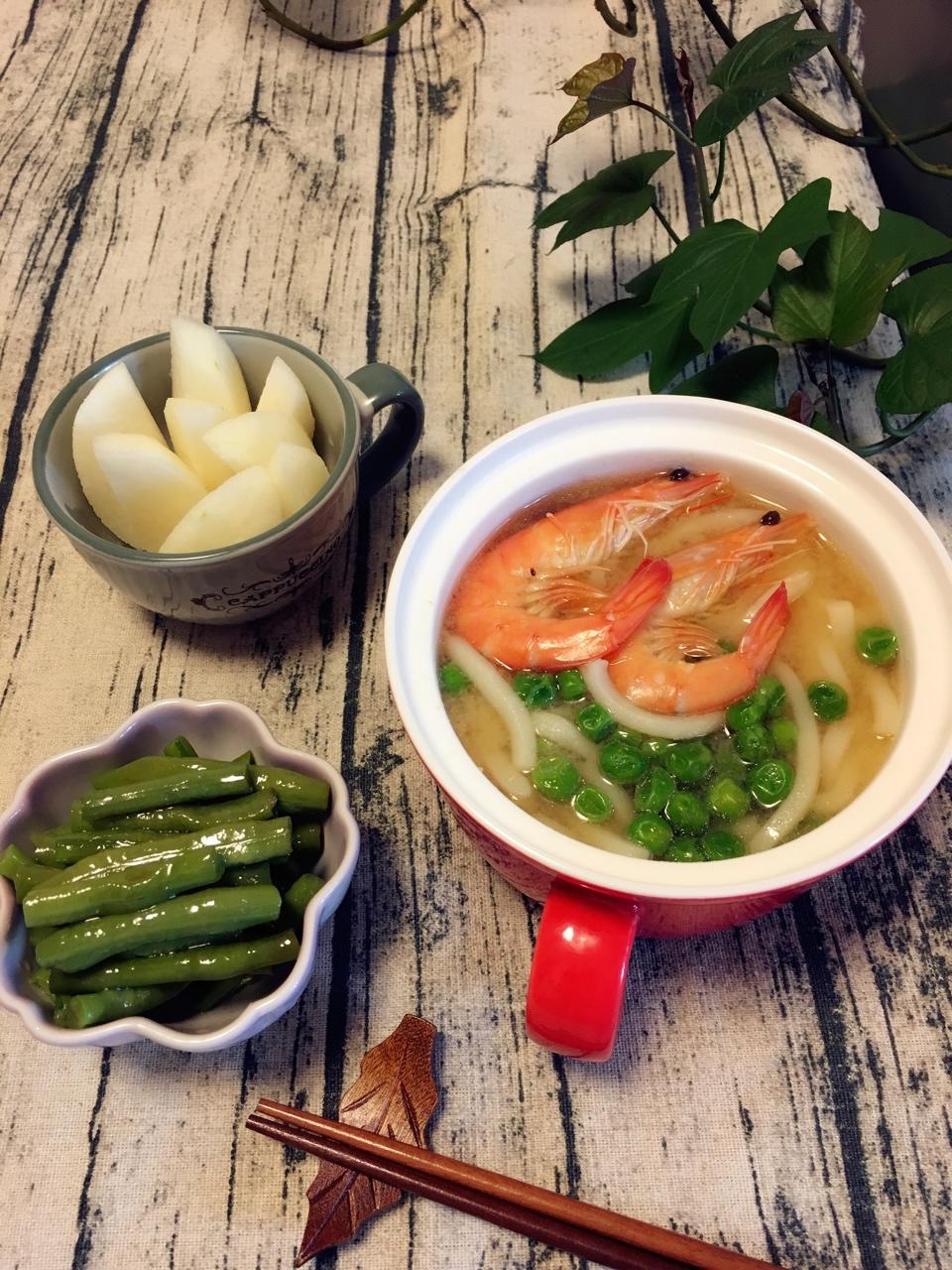 【每日早餐7.12】大虾乌冬面、凉拌长豇豆、同事家好吃的翠冠梨。