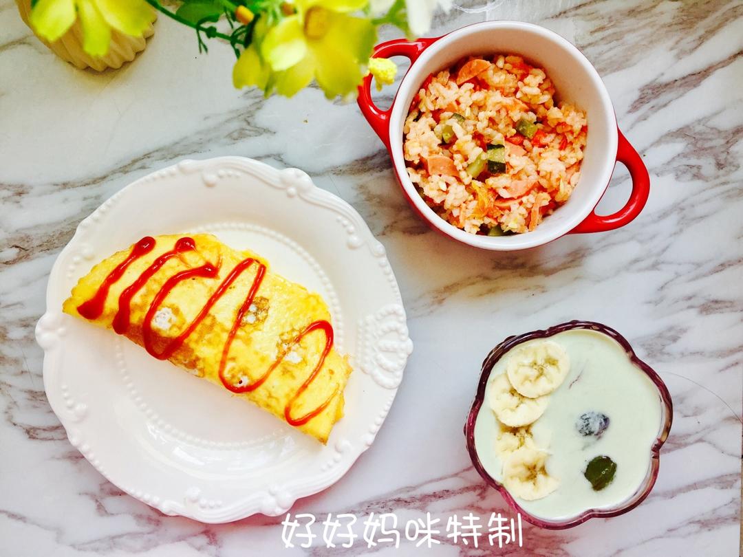 今日早餐:蛋包饭+自制抹茶酸奶+香蕉葡萄