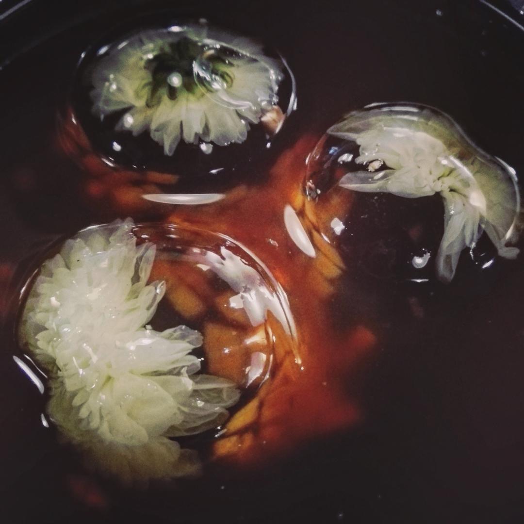 裹着杭白菊的冰粉球,跟日本的水信玄饼是同一种东西。