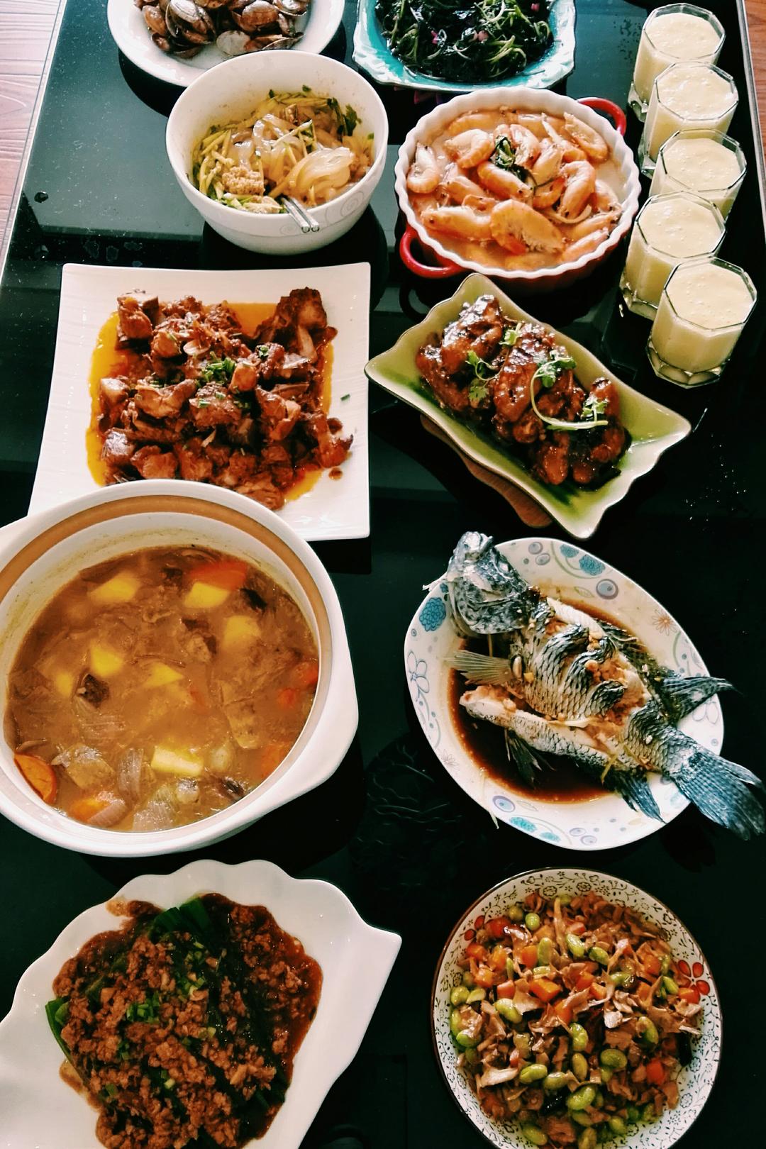 笋干毛豆。肉末泼秋葵。清蒸珍珠斑。咖喱牛腩。红烧鸡翅。红烧排骨。水煮大...