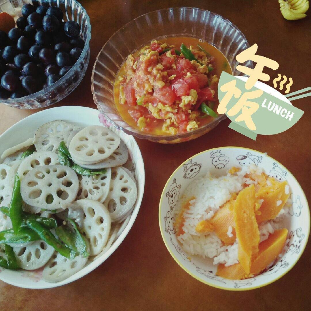 青椒炒藕和番茄炒蛋,加上香喷喷的芋头饭,真心美味の午饭~