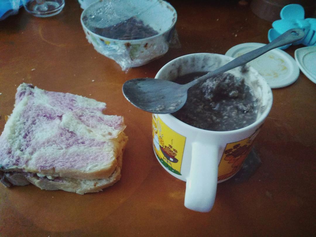 牛奶芝麻糊和豆沙包、手撕面包,好吃哒早餐⊂(`ω´∩)