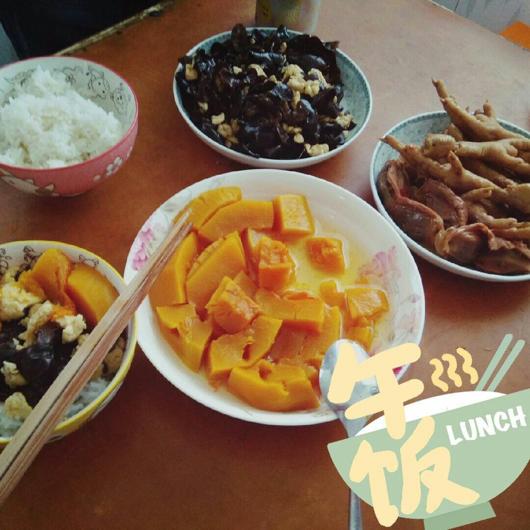 有蒸南瓜,木耳炒鸡蛋和卤鸭肫鸭爪,真心好次~...