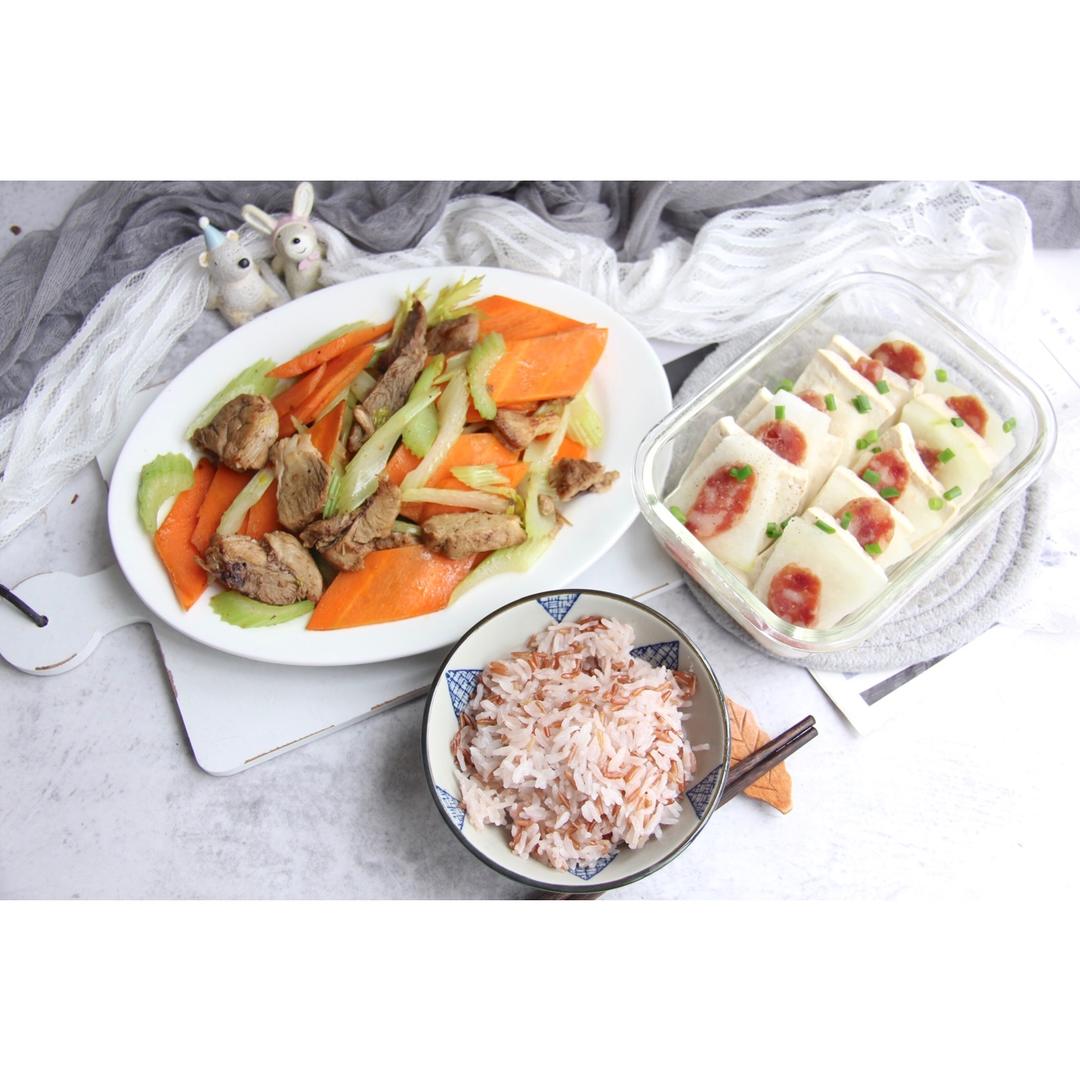 今日午食:拆骨肉炒西芹➕腊肠豆腐蒸冬瓜